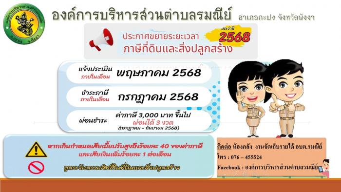 ประกาศ การขยายกำหนดเวลาดำเนินการตามพระราชบัญญัติภาษีที่ดินและสิ่งปลูกสร้าง พ.ศ.2562 ประจำปี พ.ศ. 2568 รอบที่ 2