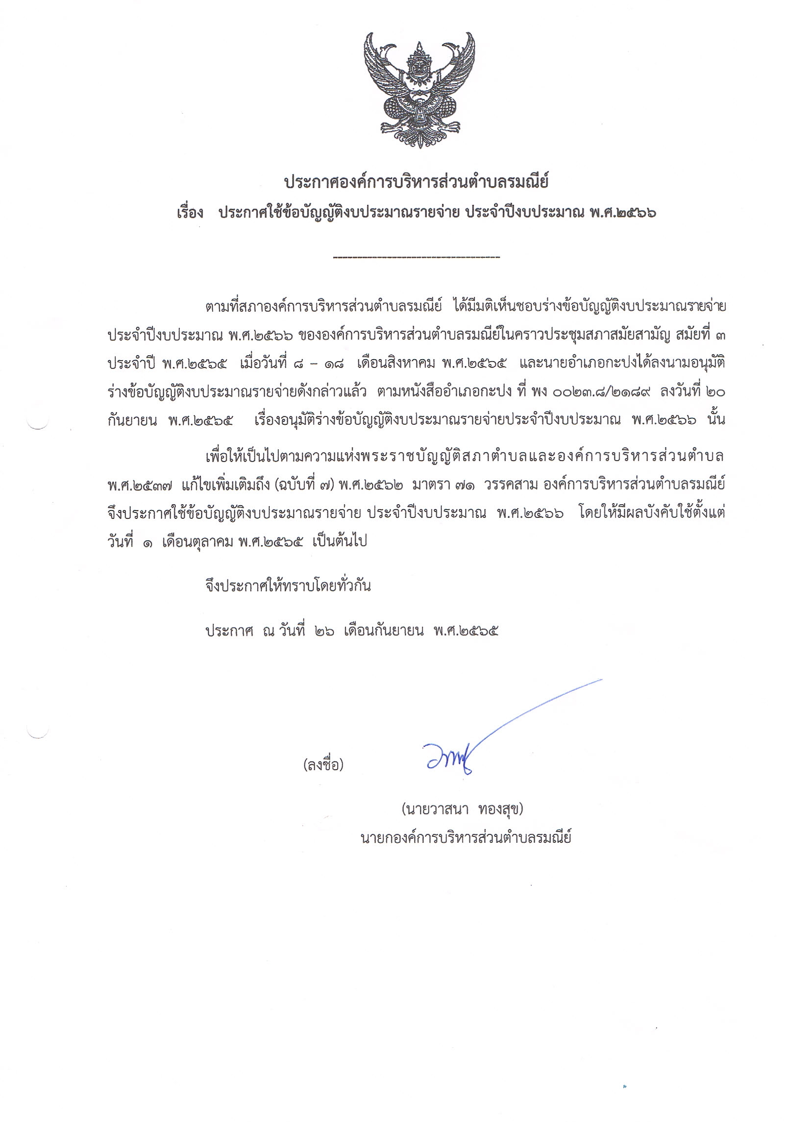 ประกาศใช้ข้อบัญญัติงบประมาณรายจ่าย ประจำปีงบประมาณ พ.ศ.2566