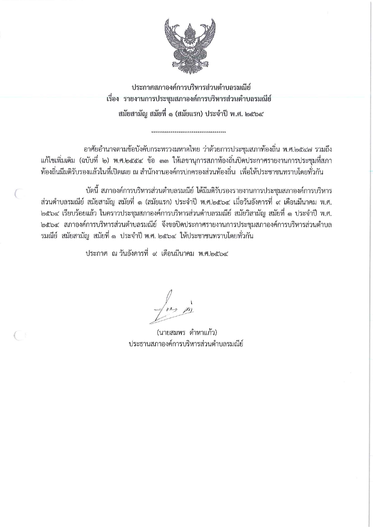 ประกาศสภาองค์การบริหารส่วนตำบลรมณีย์ เรื่อง รายงานการประชุมสภาองค์การบริหารส่วนตำบลรมณีย์ สมัยสามัญ สมัยที่ 1 (สมัยแรก) ประจำปี พ.ศ.2564