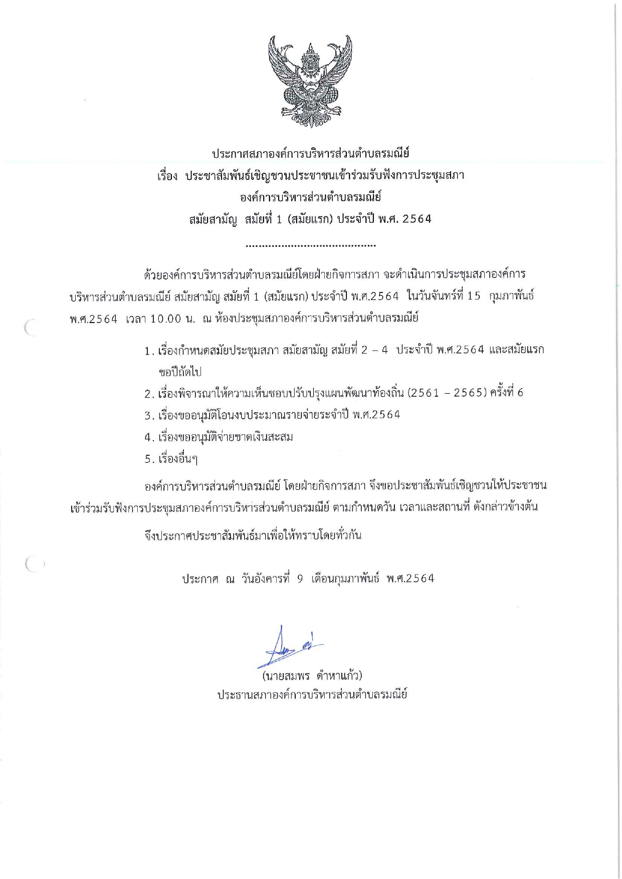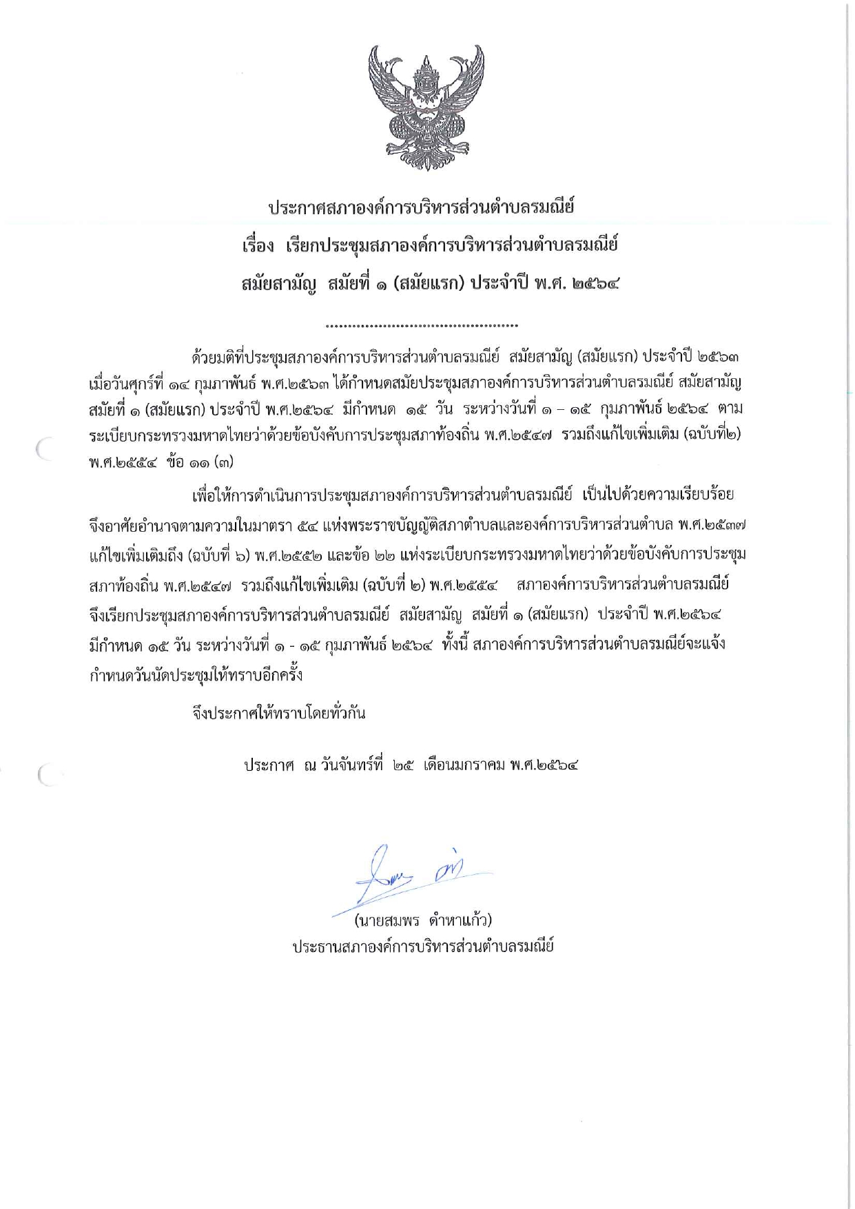 ประกาศสภาองค์การบริหารส่วนตำบลรมณีย์ เรื่อง เรียกประชุมสภาองค์การบริหารส่วนตำบลรมณีย์ สมัยสามัญ สมัยที่ 1 (สมัยแรก) ประจำปี พ.ศ.2564