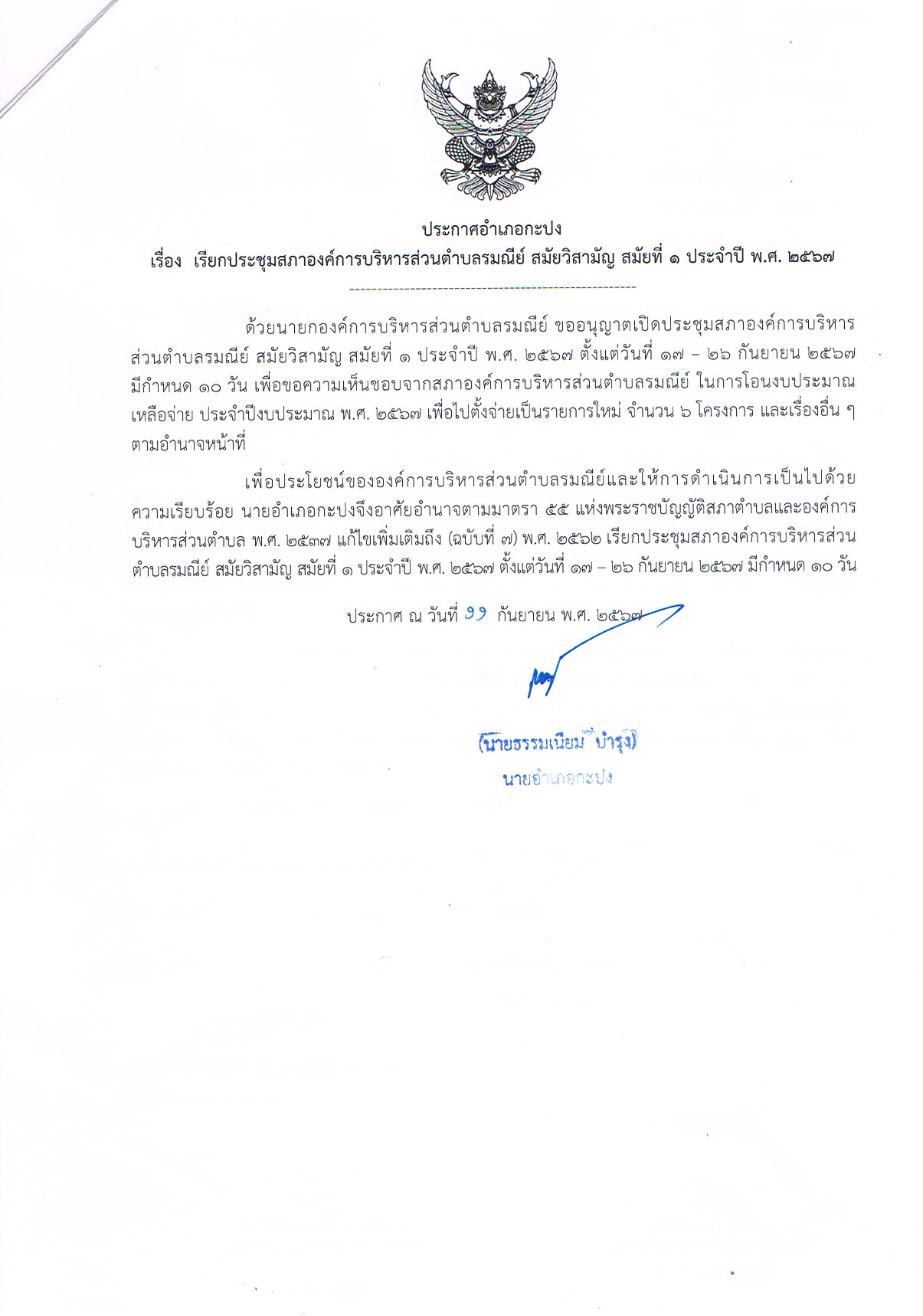 ประกาศอำเภอกะปง เรื่อง เรียกประชุมสภาองค์การบริหารส่วนตำบลรมณีย์ สมัยวิสามัญ สมัยที่ 1 ประจำปี พ.ศ.2567