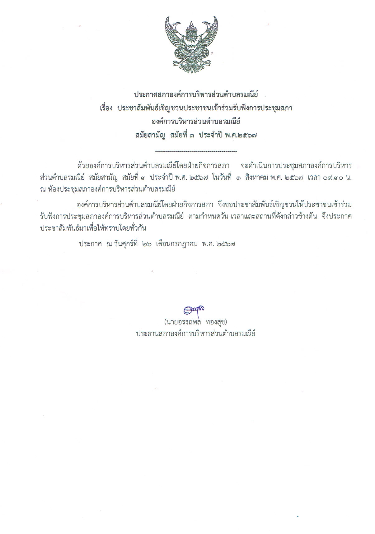 ประชาสัมพันธ์เชิญชวนประชาชนเข้าร่วมรับฟังการประชุมสภาองค์การบริหารส่วนตำบลรมณีย์ สมัยสามัญ สมัยที่ 3 ประจำปี 2567