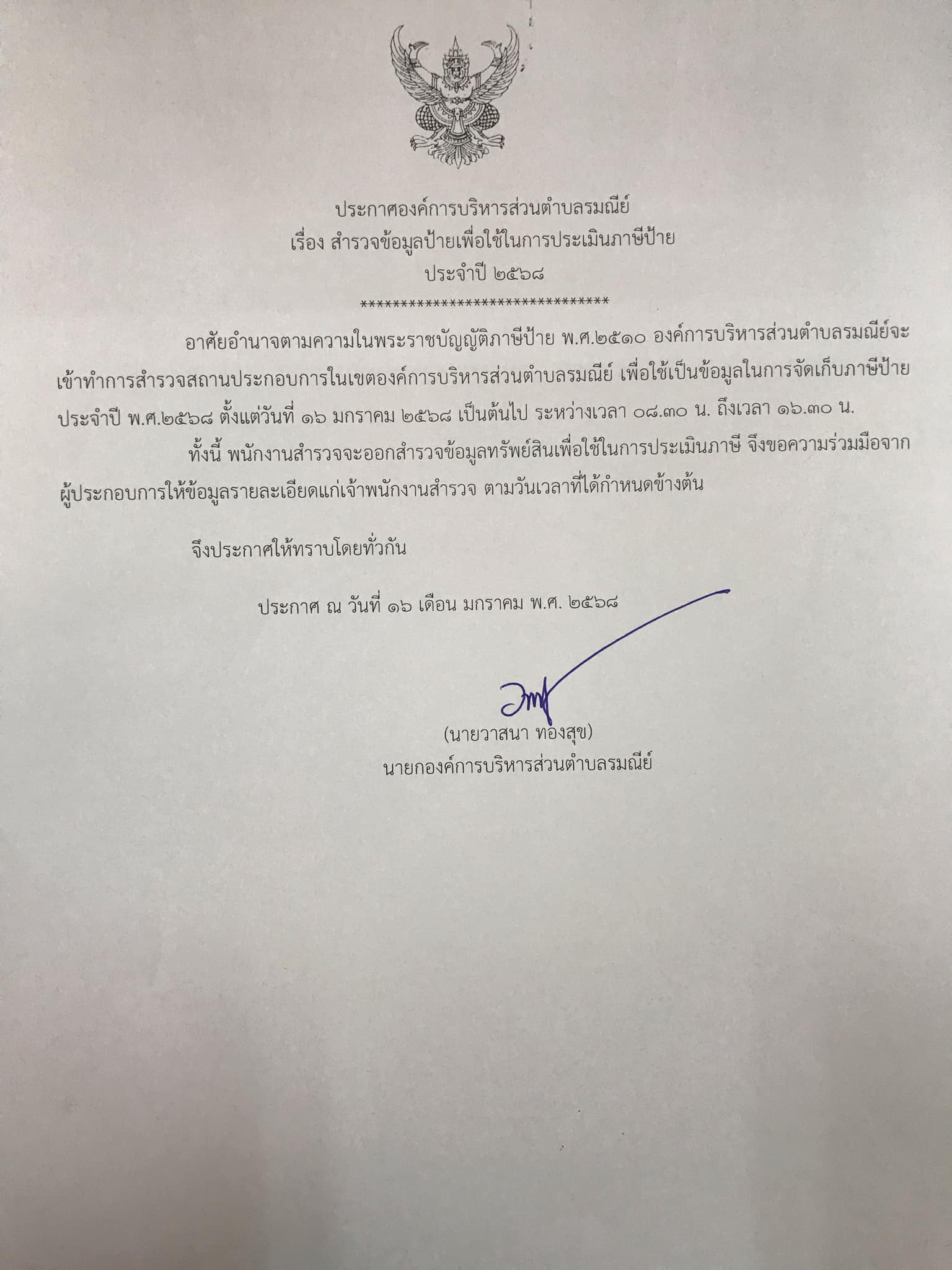 ประกาศ สำรวจข้อมูลป้ายที่ติดตั้งในเขตองค์การบริหารส่วนตำบลรมณีย์เพื่อใช้ในการประเมินภาษีป้าย ประจำปี พ.ศ.2568