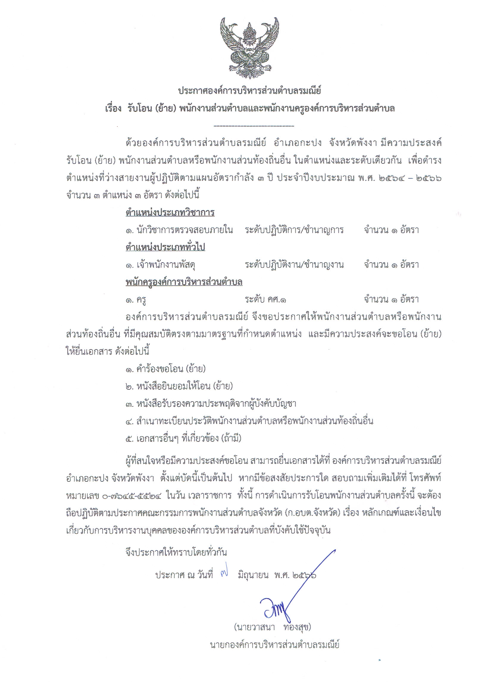 ประกาศ อบต.รมณีย์ เรื่อง รับโอน (ย้าย) พนักงานส่วนตำบลและพนักงานครู อบต.
