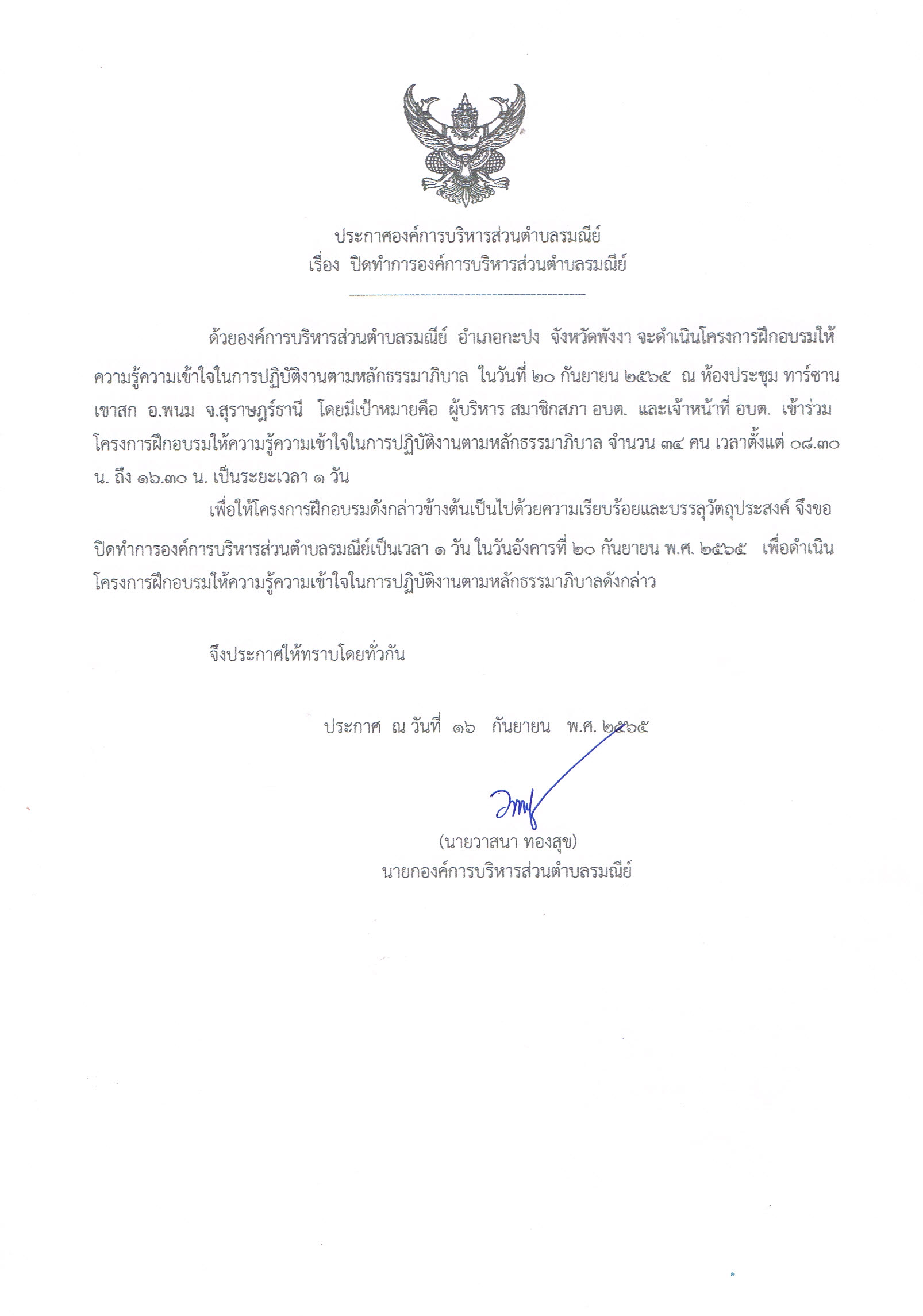 ประกาศองค์การบริหารส่วนตำบลรมณีย์ เรื่อง ปิดทำการองค์การบริหารส่วนตำบลรมณีย์ (1 วัน วันที่ 20 กันยายน 2565)