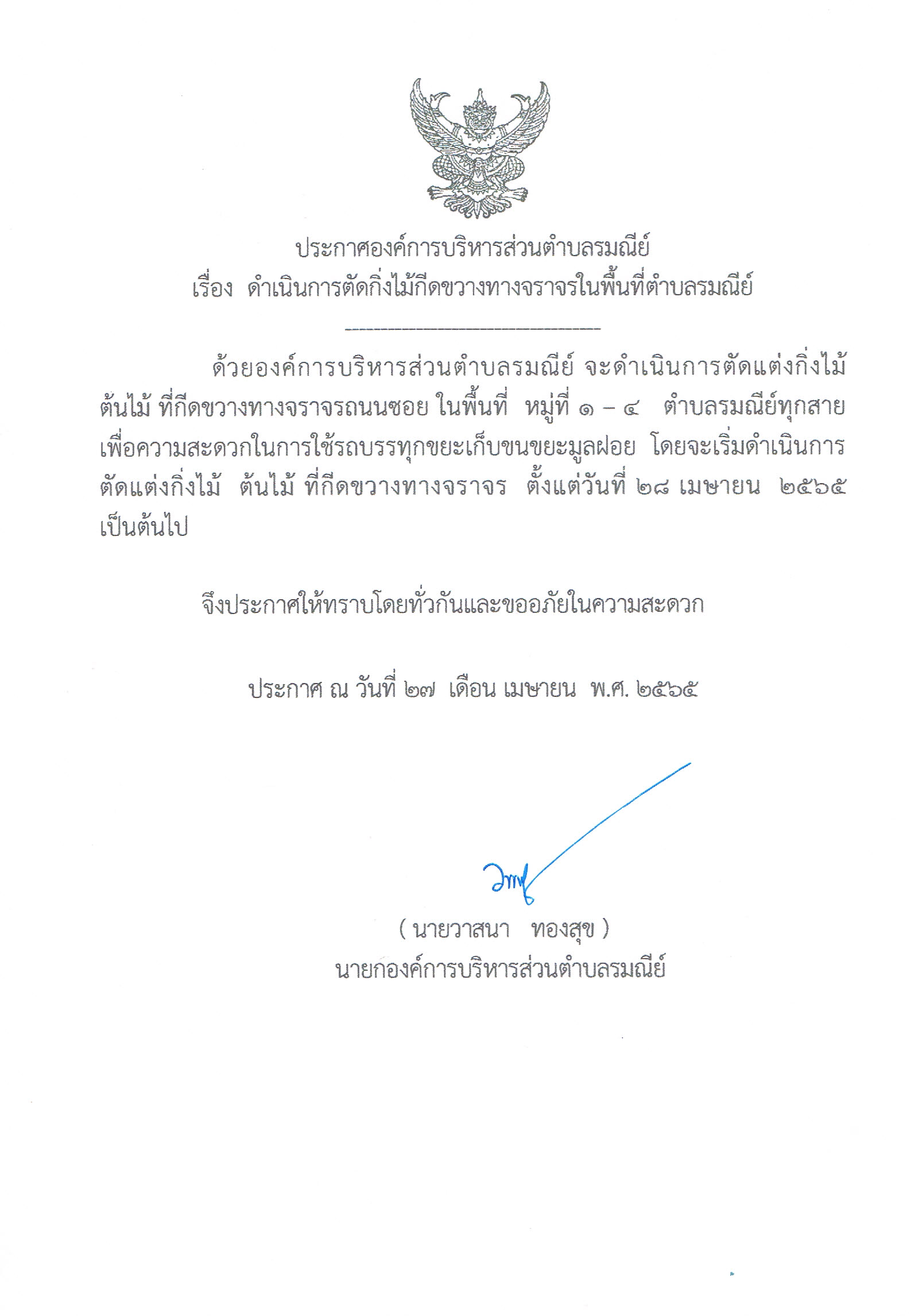 ประกาศ ดำเนินการตัดกิ่งไม้กีดขวางทางจราจรในพื้นที่ตำบลรมณีย์